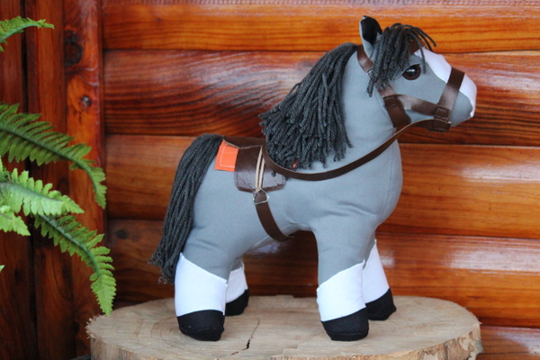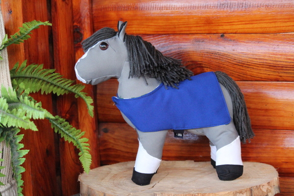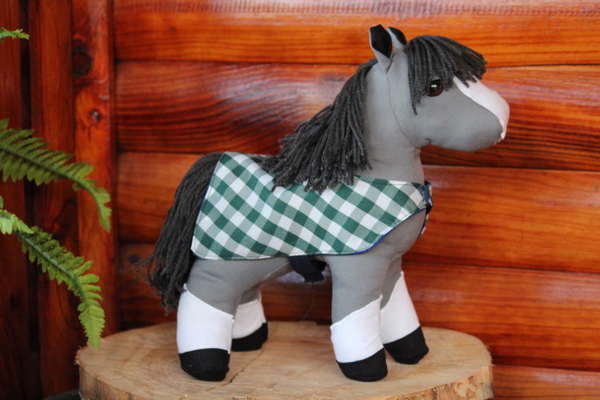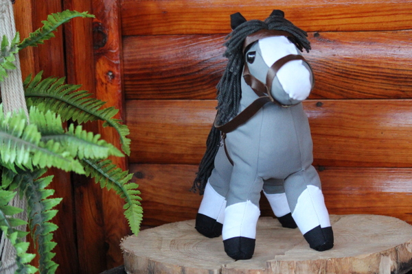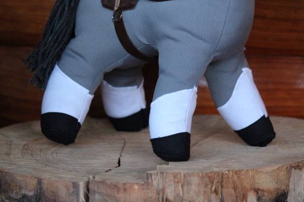 Blaze is a shiny Akhal-Teke and loves to race! This Turkish hot-blooded horse is known for its speed and endurance. They are incredibly intelligent and their coats have a beautiful shimmer. Blaze is handmade from a dove-grey fabric with white socks and a white blaze on his face. He is courageous and strong and loves jumping high fences and racing his friends!
